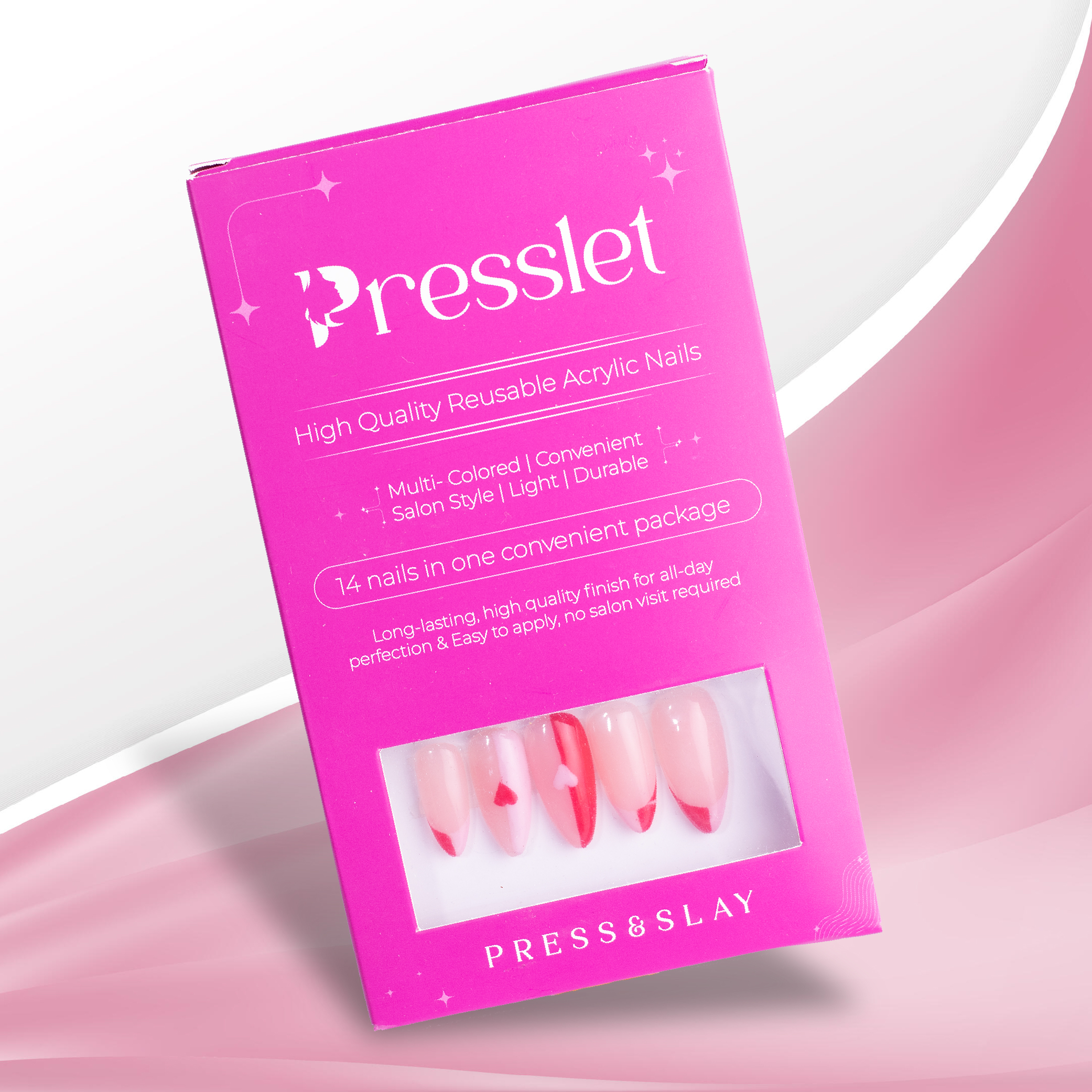 Show your sweet side with Pink Heart Press-on Nails – featuring adorable heart accents and a soft pink-and-white combo for a charming, romantic look. Crafted from high-quality reusable acrylic with a perfect fit. Easy to apply and ideal for any occasion. Complete application kit included.